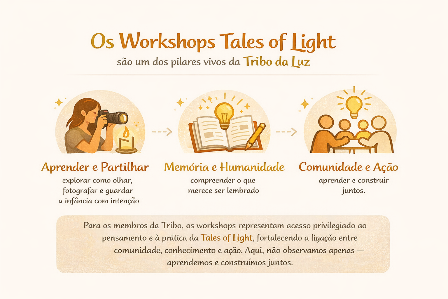 Os Workshops Tales of Light serão o ponto de partida desta caminhada. Serão o primeiro espaço de encontro, aprendizagem e partilha — e os participantes destes workshops tornar-se-ão os primeiros membros da Tribo da Luz. É assim que começa: pequeno, humano e verdadeiro.