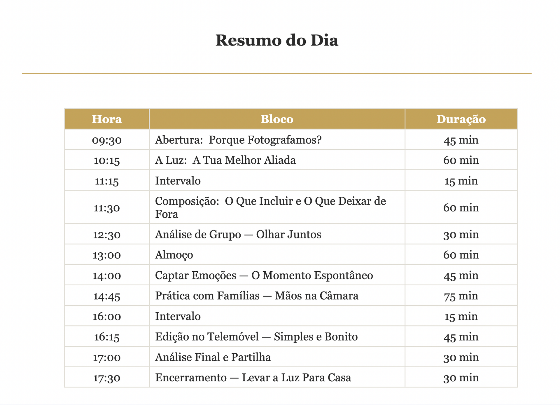Este workshop é completo em si mesmo. Sais daqui com um olhar diferente e ferramentas práticas que podes usar no dia seguinte, com o teu telemóvel, sem precisares de mais nada.